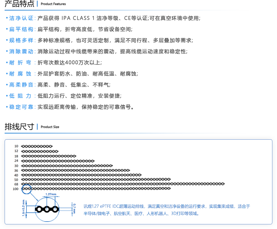 訊煜電子自主研發的1.27 ePTFE IDC潔凈運動超薄排線采用潔凈、高柔材料(潔凈等級為IPA Class1,運動次數達數千萬次),工藝上實現集束成纜,支持刺破式壓接,產品性能滿足真空和潔凈設備的運行要求,是運動超薄排線領域的又一次創新!