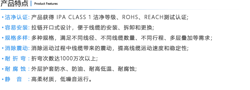 訊煜開(kāi)放易安裝式無(wú)塵拖鏈?zhǔn)且环N滿(mǎn)足無(wú)塵環(huán)境下線纜防護(hù)及運(yùn)動(dòng)需求的產(chǎn)品,拖鏈自帶屏蔽抗干擾功能(內(nèi)層采用納米屏蔽材料,吸收拖鏈內(nèi)部線纜EMI竄擾)。