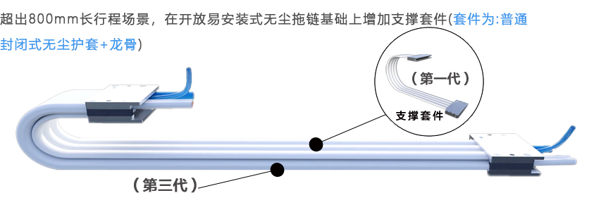 易安裝式優(yōu)于封閉式拖鏈結(jié)構(gòu),外層護(hù)套采用拉鏈開(kāi)口式結(jié)構(gòu),便于線纜的安裝和更換。中間線纜由柔性線卡分隔和固定,提高線纜排布的速度和美觀度,同時(shí)減少線纜絕緣層的磨損,延長(zhǎng)線纜的使用壽命。支持多層疊加,支持龍骨支撐,滿(mǎn)足長(zhǎng)行程應(yīng)用場(chǎng)景。
